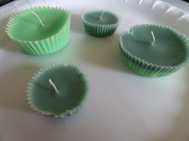 みどりのクレヨンを削って少しだけ混ぜてみたら、パステルグリーンのかわいいろうそくになった。次に、赤と青を混ぜて紫を作るつもりが、残りかすのグリーンも混ざってしまって変な色になってしまった。ひとつだけ、2色の段にしてみた。完成品は、近所のお友達にも分けてあげた。