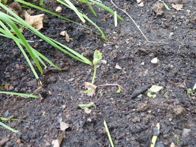 さん太は、学校で根が出てくるのを観察した後土に埋め、芽が出たものを持って帰ってきた。早速庭に植えた↓