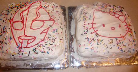 何日も前から、プレゼントとケーキを楽しみにしていた双子。今日も一日中「ケーキ食べる!」と騒いでいた。今年は、ケーキは注文せずに、家で作ってみた。さん太はウルトラマンケーキ、モモちゃんはハローキティケーキ。1週間前、モモちゃんは「双子姫のケーキが良い」といっていたが、ケーキの上にアイシングで双子姫を描くのは難しすぎるのだよ。だけど、どうやら双子姫のことは忘れてくれたようで、数日前には「キティちゃんのケーキが良い!」に変わっていた。ほっ。さん太は、ウルトラマンケーキ一筋。
