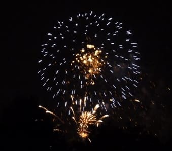 いつもは、近所の人たちと一緒に花火をやるのだけど、今年は隣町の花火大会を見に行くことにした。友達が勤めているプリスクールの駐車場からよく見えるのだという。行ってみると、すでに駐車場はいっぱいで、見物人がたくさん集まっていた。町主宰の花火大会が始まる前から、個人があちこちで花火をあげていて、一体どれが町の花火大会なんだか判らず、あっちを見たりこっちを見たり。本番が始まってみると、民家の向こうで上げられていたので、低い花火はあまり見えず。まあ、それでも大体見えたからいいか。