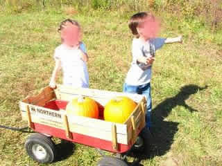 うちのコミュニティのすぐ裏に、かぼちゃ畑があって、10月の週末だけ、Pick your own pumpkinsというかぼちゃ狩りをすることができる。入り口でワゴンを借りて、かぼちゃ畑に入ると、すでにかぼちゃはつるから切られていて、客は好きなものを選んでそれをお金を払って持ち帰る。モモちゃんとさん太は、自分たちで好きなかぼちゃを選び(といっても、私のチェックが入るけど。でないと、形の悪いものを選んでしまうので)、ワゴンに乗せ、カメラに向かってポーズ。