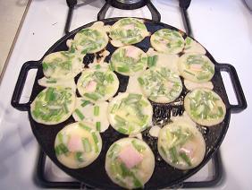 たこ焼き器を使って、今度は「スパム焼き」を作った。スパムって、最近は日本でも手に入る?しょっぱいんだけど、うちの双子は大好きなのだ。今日は、タコもなかったし他にも具になりそうなものがなく、保存の利くスパム缶詰を使い、しかもお給料日前で野菜もないから、畑に雑草のようにワサワサと生えているニラをとってきて、みじん切りにして入れてみた。貧乏メニューである(スパムは、アメリカでは貧乏人の肉と呼ばれている)。でもなかなかおいしかったよ。写真の中の、四角いピンクのかけらがスパム。