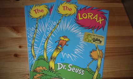 今年から、学校は食べ物持込が厳しくなり、手続きが面倒になったため(アレルギーが多いため)、食べ物は持っていかず、クラスに誕生日記念の本を寄付することにした。奇しくも、この日はDr. Seussの誕生日で、彼の絵本「Lorax」の映画が公開初日ということで、その絵本を寄付することにした。アメリカでは、何かの記念日にどこかに何かを寄付するという習慣がある。「In honor of~」とか「In celebration of~」とか、あと亡くなった人を偲んで「In memory of~」などと書いて寄付したりする。
