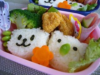 最初の日なので、キャラ弁。クマさんの耳がつぶれてるけど・・・。日本の100円ショップで色々とキャラ弁グッズを調達してきた。お弁当の上に置くだけでお弁当の持ちを良くしてくれると言う抗菌シートは特にありがたい。