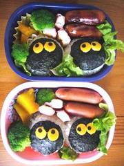 上のお弁当は、昨日の分。まっくろくろすけのキャラ弁(相変わらず、写真取るのがへたで)。でも、モモちゃんはランチの時間から気分が悪くなったといって、ほとんど食べていない。