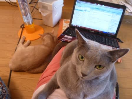 初登場、妹の猫2匹。このグレーの方が私のひざに乗るなど珍しいことなので、写真を撮った。座椅子に座ってラップトップをひざに乗せてネットしてたら、そのラップトップを押しのけてやってきたので、猫のためならひざを開けましょってことで、ラップトップはひざの向こうに押しやられ、しばらくこの状態で動けなかった。