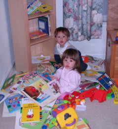 久々に双子の写真。本棚の絵本を全てかきだしてイタズラしているところをだんながキャッチ(このブログ、写真が小さいなと思っていたら、クリックすると拡大写真が出るようになっていた。それも面倒ね)。