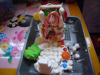 水曜日にグラハムクラッカーとアイシングで家を建て、アイシングが固まるのを待って、金曜日にキャンディなどでデコレーションした。親のボランティアが水曜日と金曜日それぞれ4人ずつ必要だというので、私は暇な方の水曜日に行ってみた。私はお菓子の家を作ったのは、1年前に一度きり。やってみたら、結構難しい。しかも、自分ひとりで作るならまだしも、一応子どもの作品だから、子どもにも作らせなければならない。でも5~6歳の子どもが上手に作れるはずもなく。