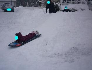 いやあ、降った、降った。こんなに降ったのは何年ぶりでしょう。30センチ以上は軽く積もってます。大雪の土曜日、双子は一日中外で遊びまくり。家の前にこんな↓雪山を作り、そりで滑り降りるなんてことまでしていた。そりで遊べるほど降るって、どんな!?