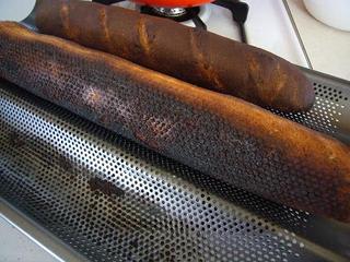 昨日、日本のクックパッドで見つけたレシピでやってみた。オーブンの温度がかなり高くて(余熱300度)大丈夫かしら?と思いつつ、霧吹きを入れてパンを入れて焼いてみた。そして、YouTubeで、スーザンボイルさんの曲を聴いていたら、突然「ピーッピーッピーッ」という雑音が!ひどいフィルムだなあと思ってたら、何と、家の煙探知機だった。急いでオーブンを開けてみると、フランスパンは無残に黒焦げ。それでようやく焦げ臭いにおいが・・・。鼻は悪くないはずだけど、全然臭わなかった。