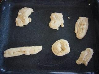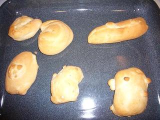最近、パンを作るときに生地を余分に作って、一時発酵の後その分を切り分けて、双子に成型をさせてみる。二人とも、プレイドウよりもずっと喜ぶ。なんてったって、食べられるもんね。だけど、色々イマジネーションを働かせてすばらしい作品を作るのは良いんだけど、細かすぎるので、成型発酵とオーブンでの焼成を経過すると、生地は膨らんでほぼ原形をとどめていなくて、一体元の形はなんだったのかわけが分からなくなっていることが多い。