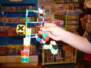 さん太もモモちゃんも、このブロックが妙に気に入り、二人でおしゃべりしながら30分以上も遊んでいた。まだまだ遊ぶ気配だったので無理やり引き剥がして帰ってきた。写真はさん太が作った作品。「見」という漢字を作ったそうだ。確かに、「見」に見えるけど、横棒が一本足りない。この写真を撮ったあと、この「見」に手が生えていた。