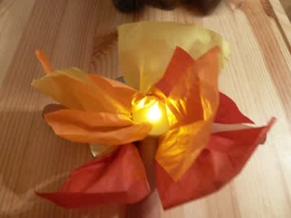 ブッククラブが終わって迎えにいったら、子どもたちはクラフトを作っていた。古いCDを使って、真ん中にライトを入れて、焚き火になっている。上に何気にチラッと写っている黒いものは猫のアビー。