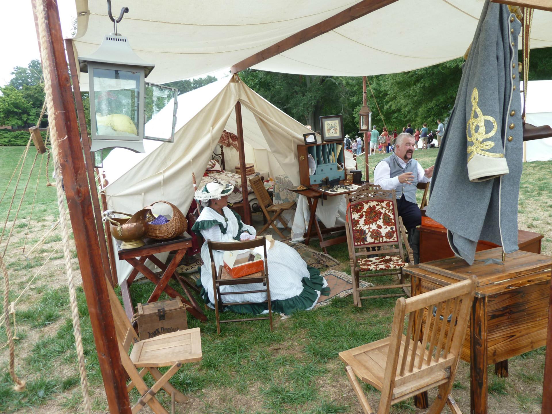 後は博物館の前で当時の戦場を再現した展示や、駅周辺の青空市場、その他いくつかの催しを見て帰ってきた。戦場で寝泊りするためのテントの中を見ると、きれいなベッドにきれいなキルトがかけられ、たんすなどの簡単な家具や生活用品一式がそろっており、仮の寝床にしてはずいぶんと豪華だこと。