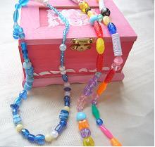 こちらは、モモちゃんの作品。ネックレスやブレスレットがいくつもできたので、これはジュエリーボックスが必要だなと思い、双子が赤ちゃんのときに参加していた育児サークルで作った箱を、モモちゃんにあげることにした。「モモちゃんだけの宝石箱だよ」といったら、大喜びで自分の作品を中に入れていた。