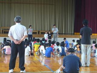 翌火曜日は、朝に体育館で全校集会があり、今度は全校生徒の前で校長先生が双子を紹介してくれた。ここでも、さん太はまったく物怖じせず、マイクを持ってはっきりとした口調で「おはようございます。○○です」と自己紹介してびっくり。次にモモちゃんはやっぱり恥ずかしがってニヤニヤしたまま何も言えず、業を煮やしたさん太がマイクを奪って「○○です」と、モモちゃんの紹介をした。さん太君、頼もしいなあ。