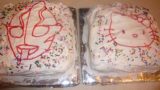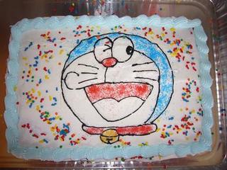 ドラえもんの顔をケーキに描いているときに、搾り出し袋が足りなくて、黒のアイシングの搾り出し袋に、薄手のサンドイッチ用ジップロックを使ったら、袋が破裂して中身が飛び出し、ドラえもんの顔が真っ黒に!!そこだけ白のアイシングをふき取って新しい白いアイシングを上からぬりぬりして何とか再生できたけれど、一時はどうなることかと・・・。