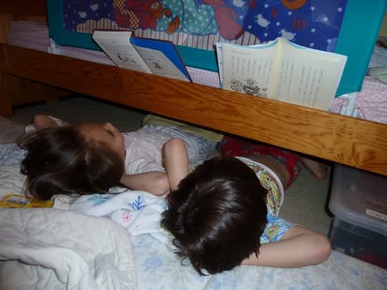 双子の国語の宿題は、一日20分の読書。実家の父が、布団に寝ながらハンズフリーで読書ができるライトつき読書台を持っていて、いつも「いいな~」と思っていたのだけど、双子にはそんな小道具いりません。