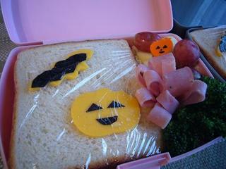 一年生になって、日本人のお友達と別のクラスになってしまったためか、ご飯のお弁当を持っていくのを嫌がるさん太。モモちゃんは全然気にしないけど。そこで、サンドウィッチのキャラ弁、ハロウィンバージョン。これならどーだ。さん太は納得、全部食べたと報告してくれた。チーズに海苔、おつまみみたいな味で結構いけます。